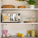 Mikrohullámú sütő, elektromos vízforraló és sütő szintén biztosított a konyhában.